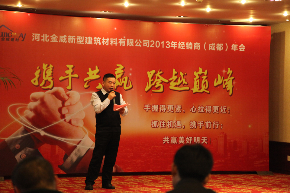 此次經(jīng)銷商年會中由總經(jīng)理高永濤先生為會議致辭總結2012年工作業(yè)績并對2013年公司的發(fā)展進行規(guī)劃。在2012年金威橡塑的銷售取得了驕人的成績,為感謝經(jīng)銷商朋友的大力支持,高總經(jīng)理帶領金威團隊向經(jīng)銷商行金威特有的“三道禮儀”,同時也得到了全場所有經(jīng)銷商朋友的共鳴,會場響起了熱烈的掌聲。對于2013年的目標,鼓勵我們經(jīng)銷商家人對自己區(qū)域的目標實行公眾承諾,并讓我們各區(qū)域之間的經(jīng)銷商朋友進行PK挑戰(zhàn),產(chǎn)生良性競爭,更大的促進各經(jīng)銷商朋友的激情。