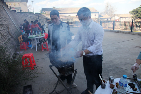 午后,來到燒烤區,大家迫不及待地開始分工合作, 誘人的食物被切片串烤,有茄子、香菇、青椒、肉串等等。雖然很多都被烤焦了,但是大家仍然吃得很開心,享受著難得的悠閑。