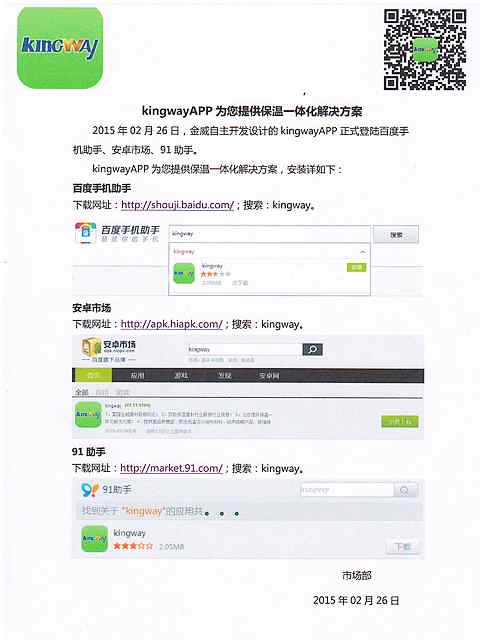 2015年02月26日,金威自主開發(fā)設(shè)計的kingwayAPP正式登陸百度手機(jī)助手、安卓市場、91助手。