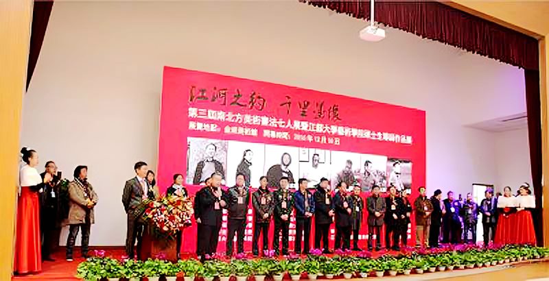 12月18日上午,“江河之約 千里墨緣”南北書畫家七人展暨江蘇大學藝術學院碩士生導師作品展在留各莊鎮金威美術館舉行。