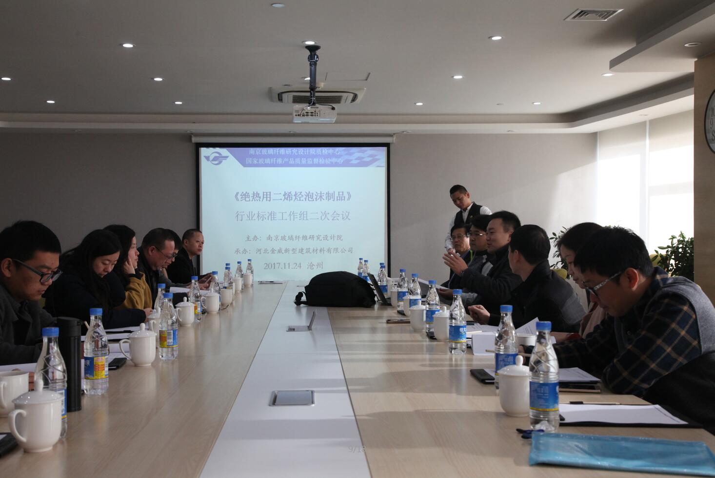 建材行業標準《絕熱用二烯烴泡沫制品》工作組二次會議于2017年11月24日在滄州渤海酒店召開。本次會議由南京玻璃纖維研究設計院主辦,河北金威新型建筑材料有限公司承辦。會議主要就《絕熱用二烯烴泡沫制品》標準的驗證實驗結果、返回意見和標準草案進行了討論。