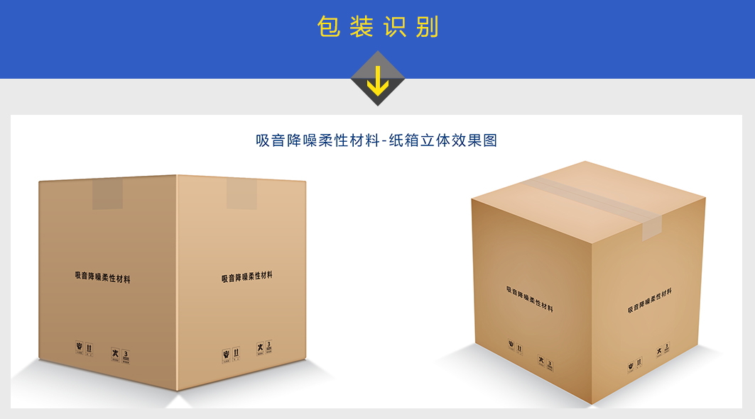 二、"金威"牌吸音降噪系列產品包裝為紙箱包裝,上面統一打印有吸音降噪柔性材料的字樣。